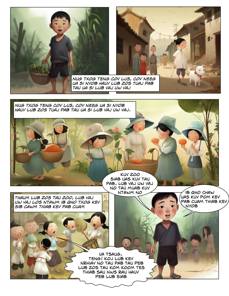 Here’s another attempt at creating comic book with consistent characters using Midjourney. I used ChatGPT to translate it to the Hmong language.